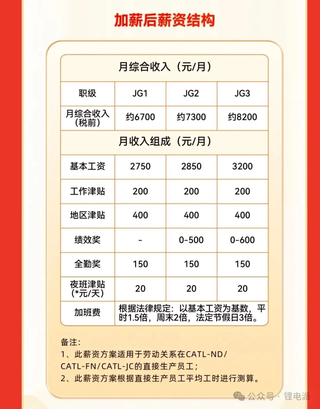 刚了解到。宁德时代为1-6职级蓝领员工上调基本工资150元/月,其他薪资结构不变,加班费计算基数同步提高。